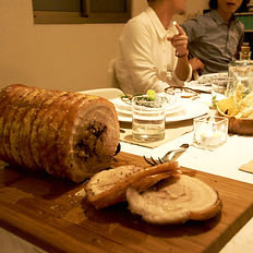 整隻豬腹肉以十種香草香料乾醃熟成24小時,再以低溫慢烤而成的超級宴客菜。